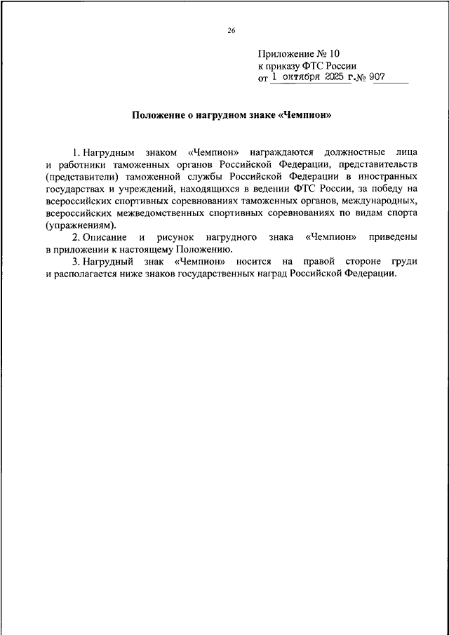 ПРИКАЗ ФТС РФ от 01.10.2025 N 907