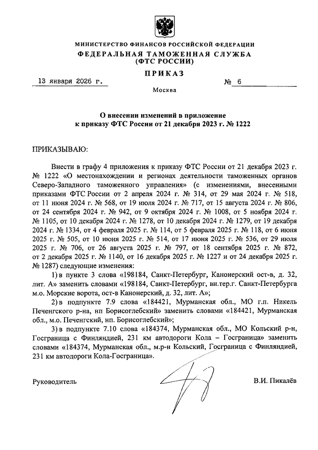 ПРИКАЗ ФТС РФ от 13.01.2026 N 6