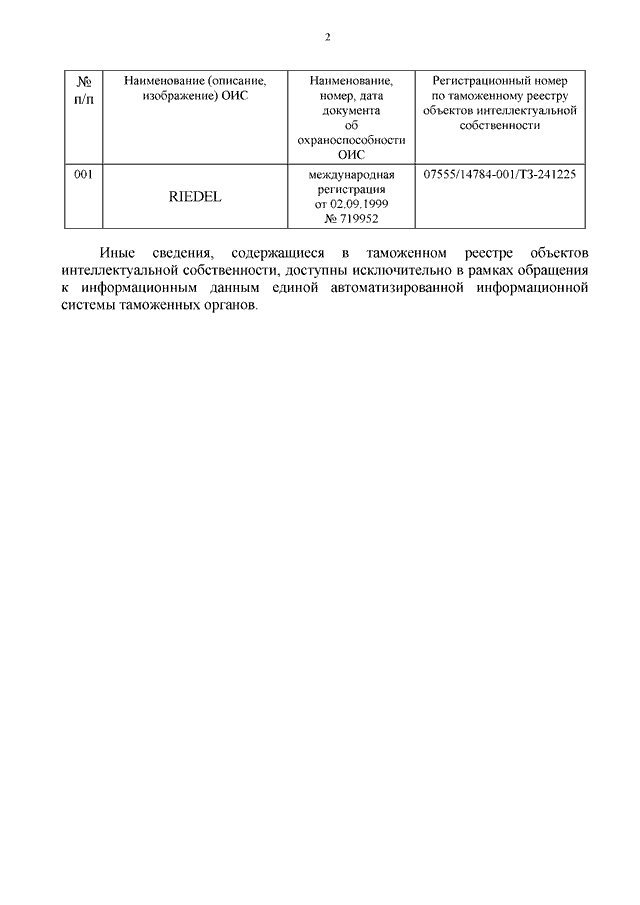 "О ТОВАРНОМ ЗНАКЕ "RIEDEL" ПО РЕГ. N 719952"