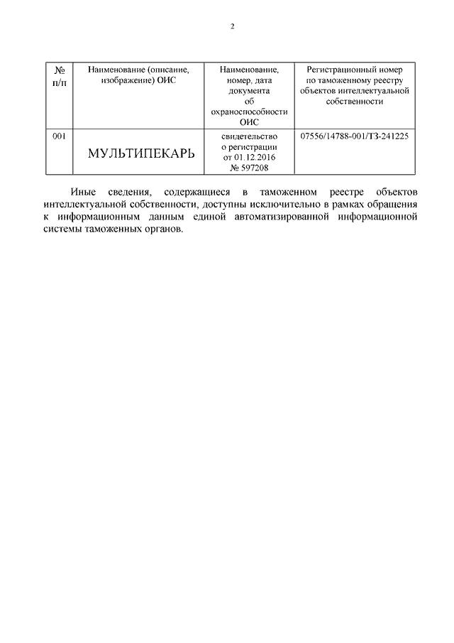 "О ТОВАРНОМ ЗНАКЕ "МУЛЬТИПЕКАРЬ" ПО РЕГ. N 597208"