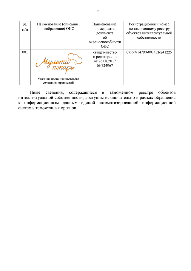 "О ТОВАРНОМ ЗНАКЕ "МУЛЬТИПЕКАРЬ" ПО РЕГ. N 724967"
