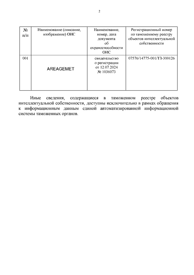 "О ТОВАРНОМ ЗНАКЕ "AREAGEMET" ПО РЕГ. N 1036073"