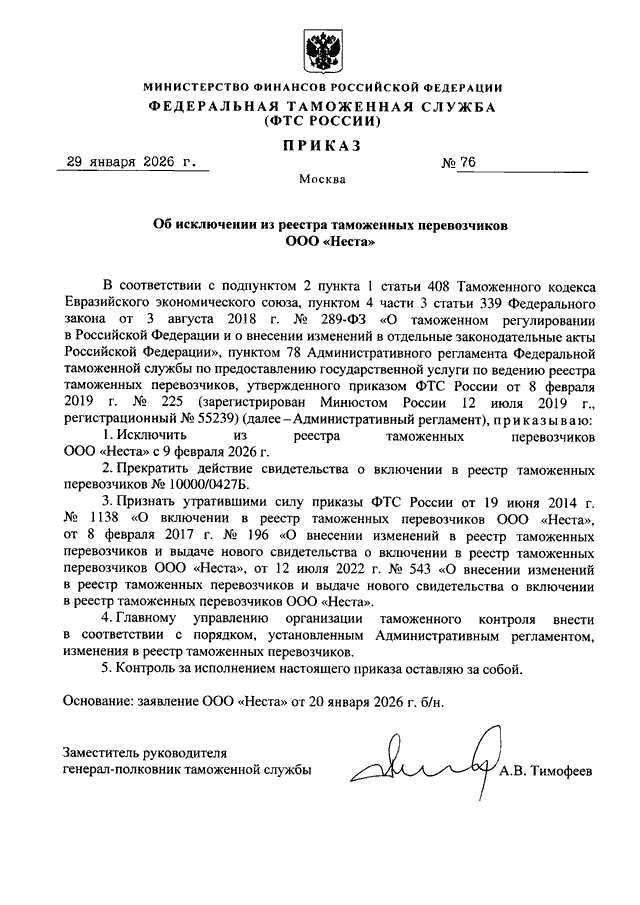 ПРИКАЗ ФТС РФ от 29.01.2026 N 76