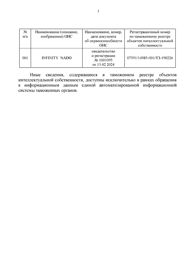 "О ТОВАРНОМ ЗНАКЕ "INFINITY NADO" (РЕГ. N 1001095)"