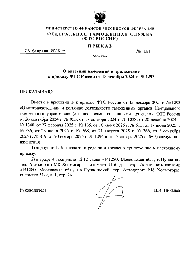 ПРИКАЗ ФТС РФ от 25.02.2026 N 151