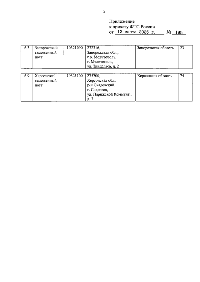 ПРИКАЗ ФТС РФ от 12.03.2026 N 195