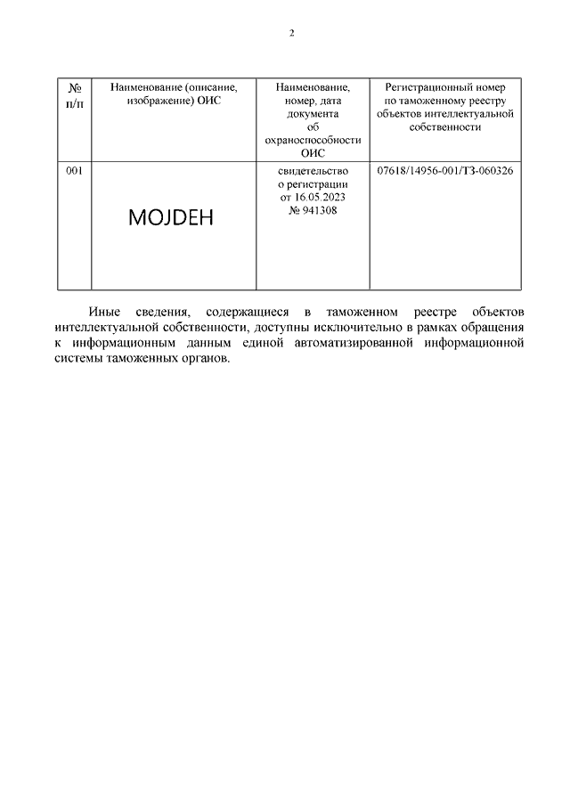 "О ТОВАРНОМ ЗНАКЕ "MOJDEH" ПО РЕГ. N 941308"