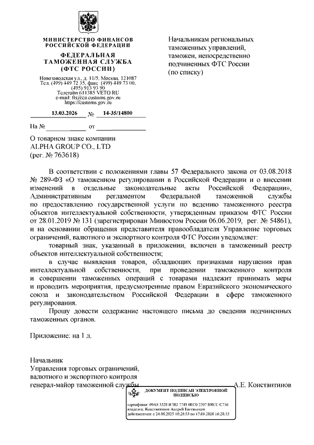 ПИСЬМО ФТС РФ от 13.03.2026 N 14-35/14800