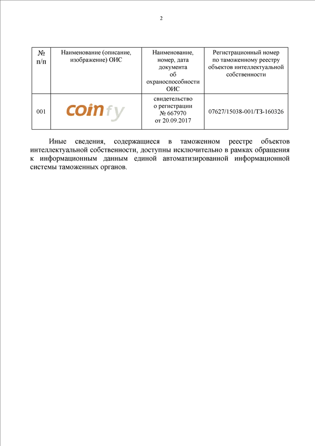 "О ТОВАРНОМ ЗНАКЕ "COINFY" (РЕГ. N 667970)"