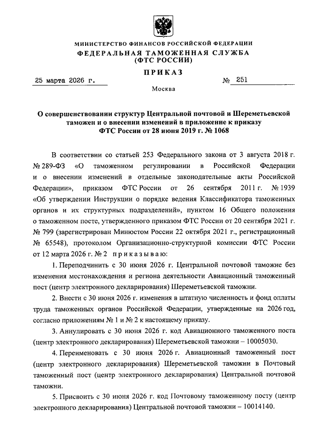 "О СОВЕРШЕНСТВОВАНИИ СТРУКТУР ЦЕНТРАЛЬНОЙ ПОЧТОВОЙ И ШЕРЕМЕТЬЕВСКОЙ ТАМОЖЕН И О ВНЕСЕНИИ ИЗМЕНЕНИЙ В ПРИЛОЖЕНИЕ К ПРИКАЗУ ФТС РОССИИ ОТ 28 ИЮНЯ 2019 Г. N 1068"
