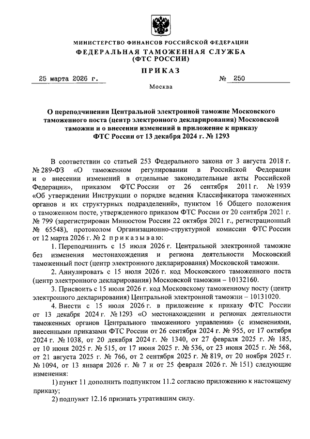 ПРИКАЗ ФТС РФ от 25.03.2026 N 250 "О ПЕРЕПОДЧИНЕНИИ ЦЕНТРАЛЬНОЙ ЭЛЕКТРОННОЙ ТАМОЖНЕ МОСКОВСКОГО