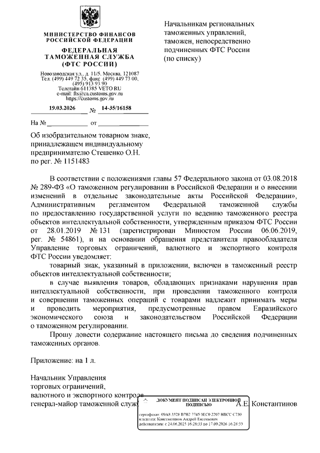 ПИСЬМО ФТС РФ от 19.03.2026 N 14-35/16158