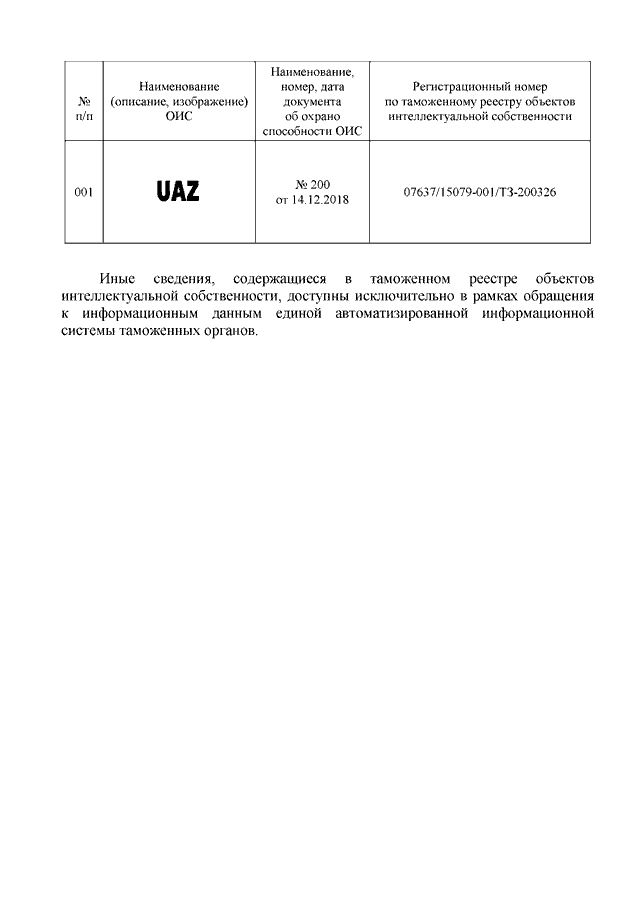 "О ТОВАРНОМ ЗНАКЕ "UAZ" (РЕГ. N 200)"
