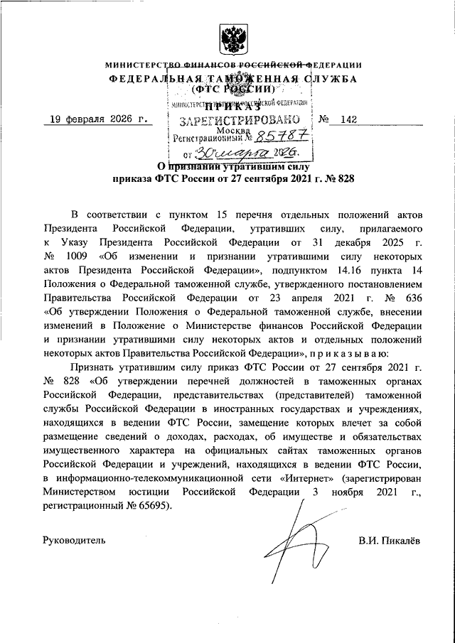 "О ПРИЗНАНИИ УТРАТИВШИМ СИЛУ ПРИКАЗА ФТС РОССИИ ОТ 27 СЕНТЯБРЯ 2021 Г. N 828"