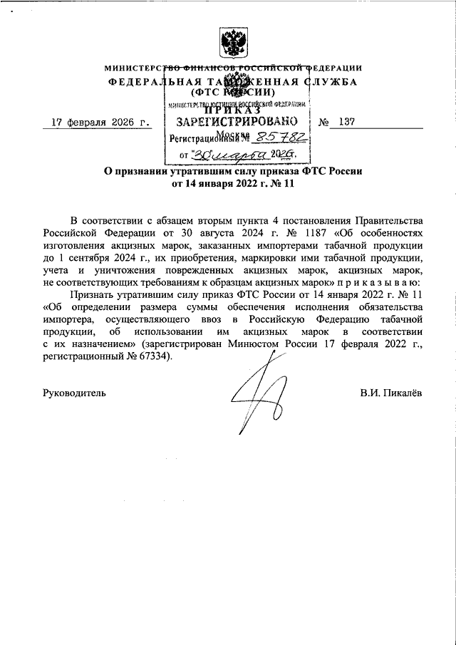 "О ПРИЗНАНИИ УТРАТИВШИМ СИЛУ ПРИКАЗА ФТС РОССИИ ОТ 14 ЯНВАРЯ 2022 Г. N 11"