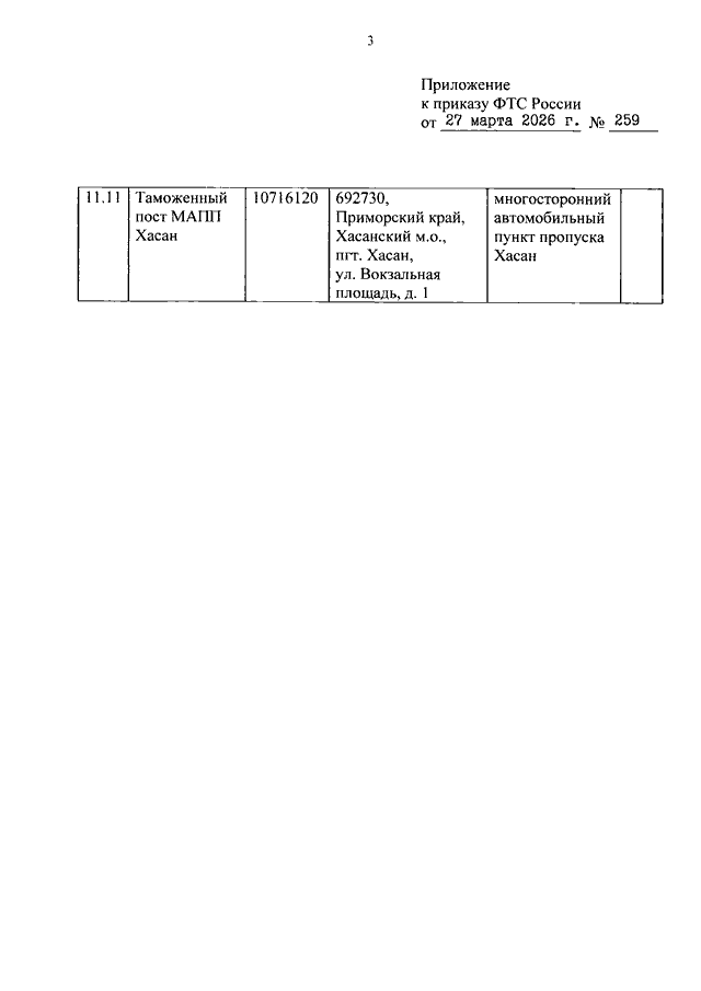 "О СОЗДАНИИ ТАМОЖЕННОГО ПОСТА МАПП ХАСАН УССУРИЙСКОЙ ТАМОЖНИ И О ВНЕСЕНИИ ИЗМЕНЕНИЙ В ПРИЛОЖЕНИЕ К ПРИКАЗУ ФТС РОССИИ ОТ 28 ИЮНЯ 2019 Г. N 1069"
