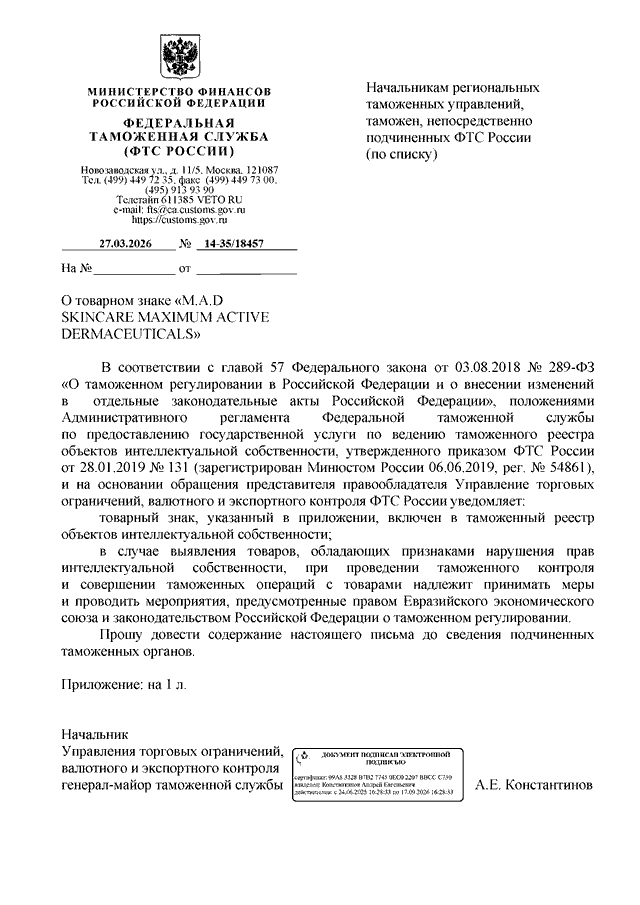ПИСЬМО ФТС РФ от 27.03.2026 N 14-35/18457