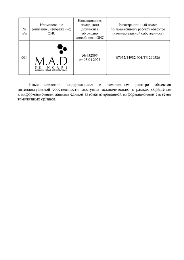 "О ТОВАРНОМ ЗНАКЕ "M.A.D SKINCARE MAXIMUM ACTIVE DERMACEUTICALS"
