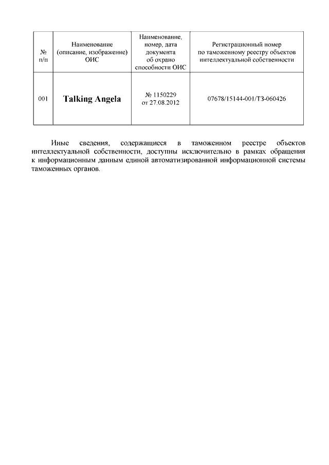 "О ТОВАРНОМ ЗНАКЕ "TALKING ANGELA" (РЕГ. N 1150229)"