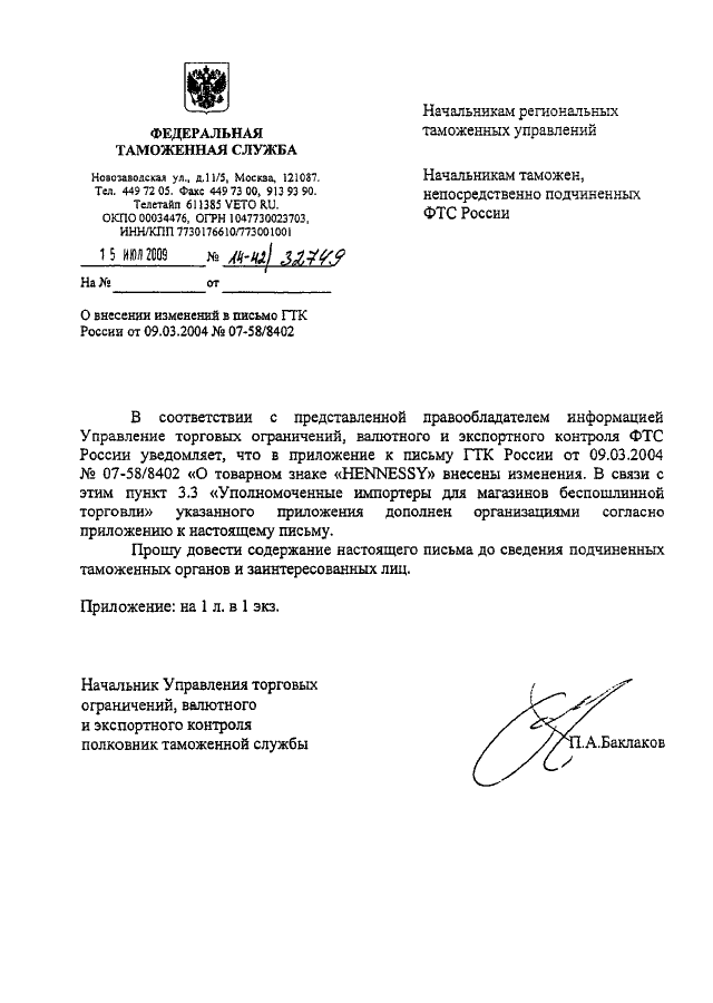 "О ВНЕСЕНИИ ИЗМЕНЕНИЙ В ПИСЬМО ГТК РОССИИ ОТ 09.03.2004 N 07-58/8402"