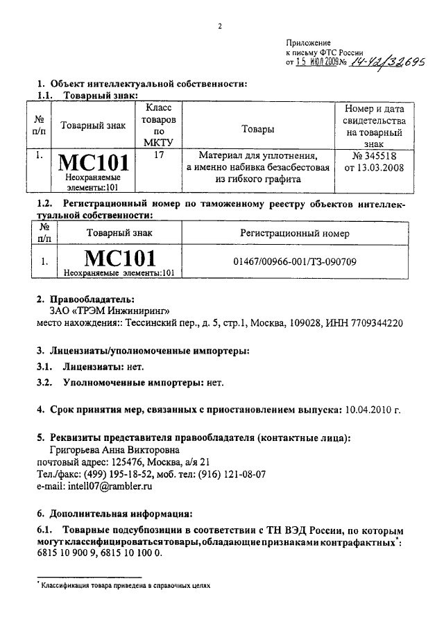 ПИСЬМО ФТС РФ от 15.07.2009 N 14-42/32695