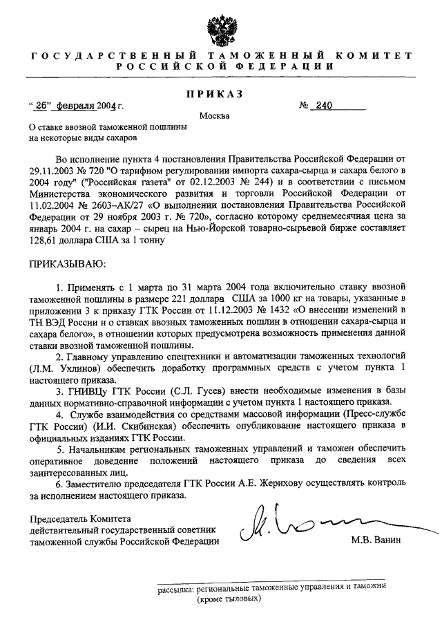 ПРИКАЗ ГТК РФ от 26.02.2004 N 240