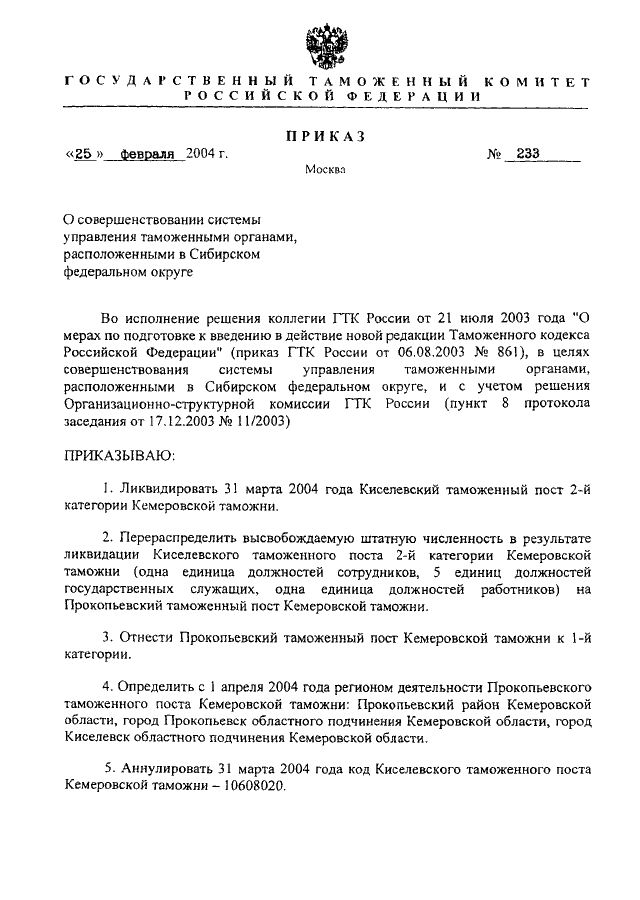 ПРИКАЗ ГТК РФ от 25.02.2004 N 233