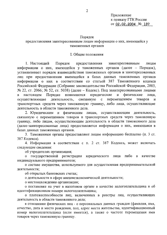 ПРИКАЗ ГТК РФ от 02.02.2004 N 137