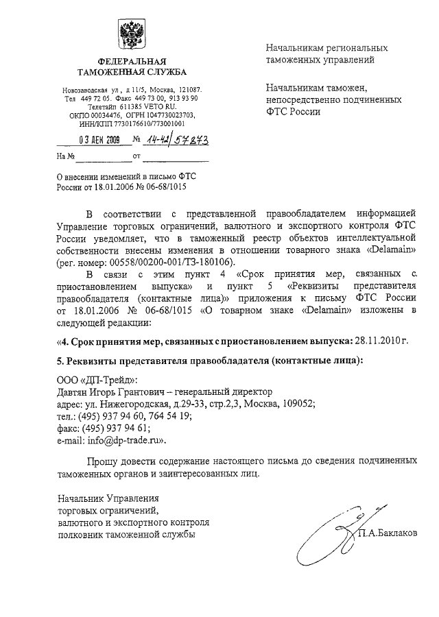 ПИСЬМО ФТС РФ от 03.12.2009 N 14-42/57873