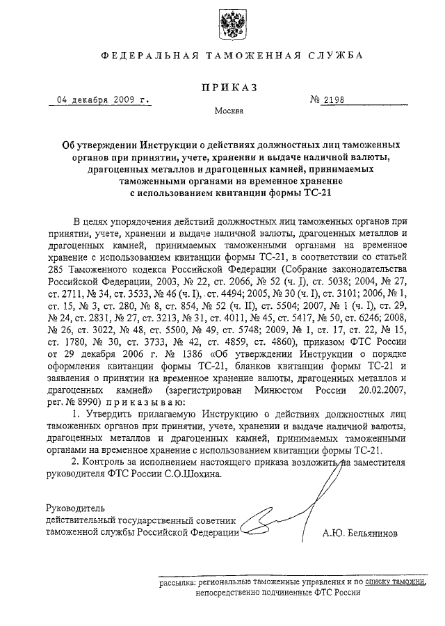 ПРИКАЗ ФТС РФ от 04.12.2009 N 2198 "ОБ УТВЕРЖДЕНИИ ИНСТРУКЦИИ О ДЕЙСТВИЯХ ДОЛЖНОСТНЫХ ЛИЦ ТАМОЖЕННЫХ