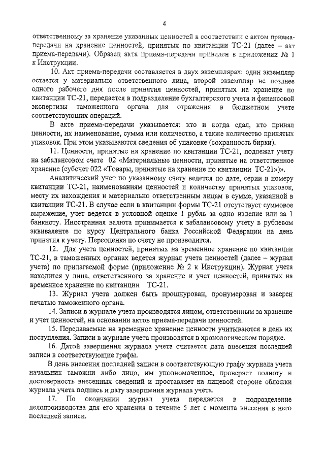 "ОБ УТВЕРЖДЕНИИ ИНСТРУКЦИИ О ДЕЙСТВИЯХ ДОЛЖНОСТНЫХ ЛИЦ ТАМОЖЕННЫХ ОРГАНОВ ПРИ ПРИНЯТИИ, УЧЕТЕ, ХРАНЕНИИ И ВЫДАЧЕ НАЛИЧНОЙ ВАЛЮТЫ, ДРАГОЦЕННЫХ МЕТАЛЛОВ И ДРАГОЦЕННЫХ КАМНЕЙ, ПРИНИМАЕМЫХ ТАМОЖЕННЫМИ ОРГАНАМИ НА ВРЕМЕННОЕ ХРАНЕНИЕ С ИСПОЛЬЗОВАНИЕМ КВИТАНЦИИ ФОРМЫ ТС-21"