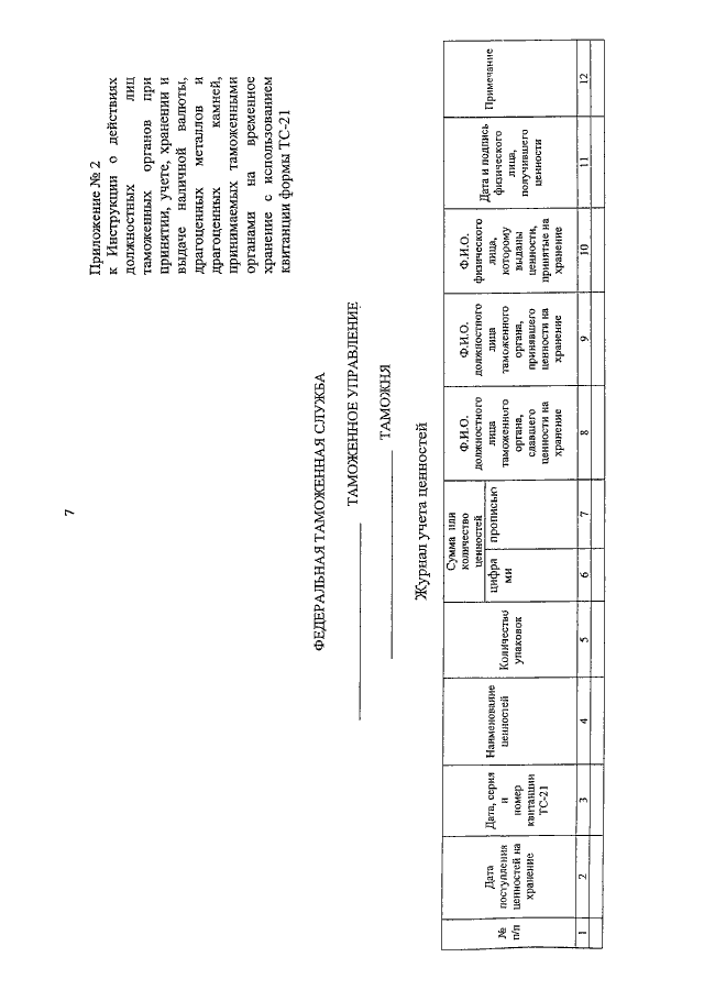 "ОБ УТВЕРЖДЕНИИ ИНСТРУКЦИИ О ДЕЙСТВИЯХ ДОЛЖНОСТНЫХ ЛИЦ ТАМОЖЕННЫХ ОРГАНОВ ПРИ ПРИНЯТИИ, УЧЕТЕ, ХРАНЕНИИ И ВЫДАЧЕ НАЛИЧНОЙ ВАЛЮТЫ, ДРАГОЦЕННЫХ МЕТАЛЛОВ И ДРАГОЦЕННЫХ КАМНЕЙ, ПРИНИМАЕМЫХ ТАМОЖЕННЫМИ ОРГАНАМИ НА ВРЕМЕННОЕ ХРАНЕНИЕ С ИСПОЛЬЗОВАНИЕМ КВИТАНЦИИ ФОРМЫ ТС-21"