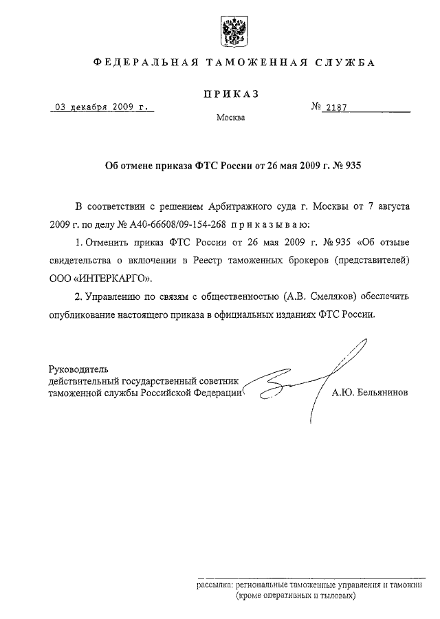 "ОБ ОТМЕНЕ ПРИКАЗА ФТС РОССИИ ОТ 26 МАЯ 2009 Г. N 935"