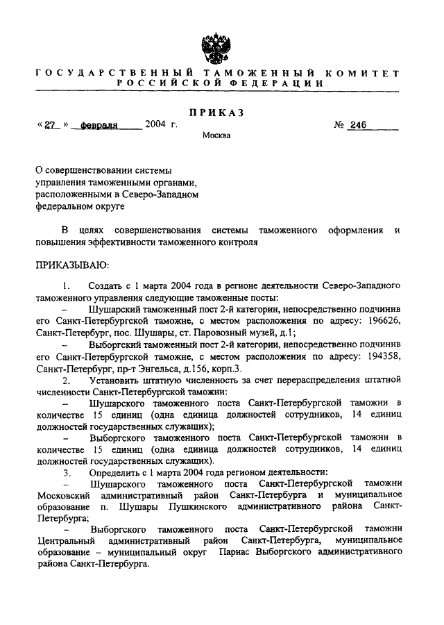 ПРИКАЗ ГТК РФ от 27.02.2004 N 246