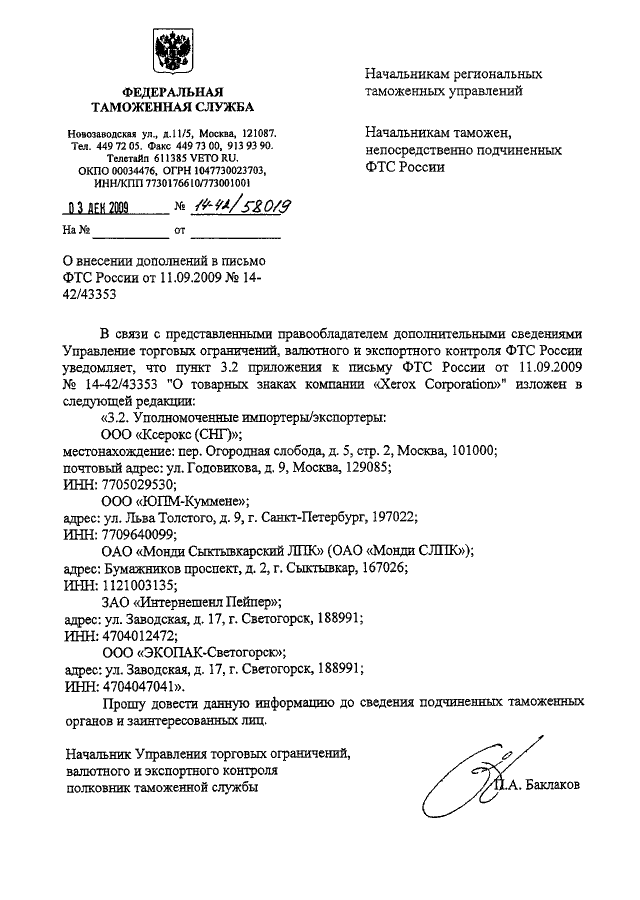 "О ВНЕСЕНИИ ДОПОЛНЕНИЙ В ПИСЬМО ФТС РОССИИ ОТ 11.09.2009 N 14-42/43353"