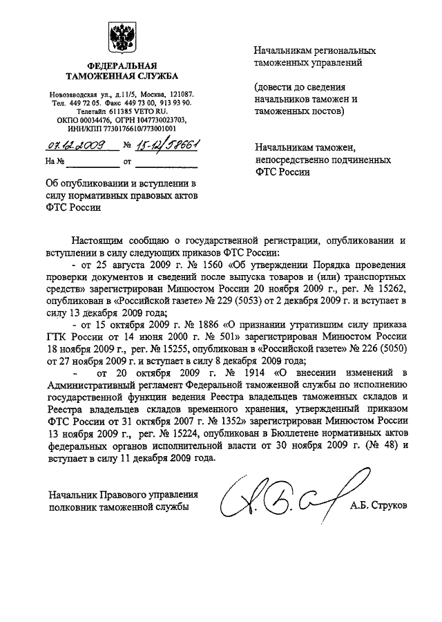 "ОБ ОПУБЛИКОВАНИИ И ВСТУПЛЕНИИ В СИЛУ НОРМАТИВНЫХ ПРАВОВЫХ АКТОВ ФТС РОССИИ"