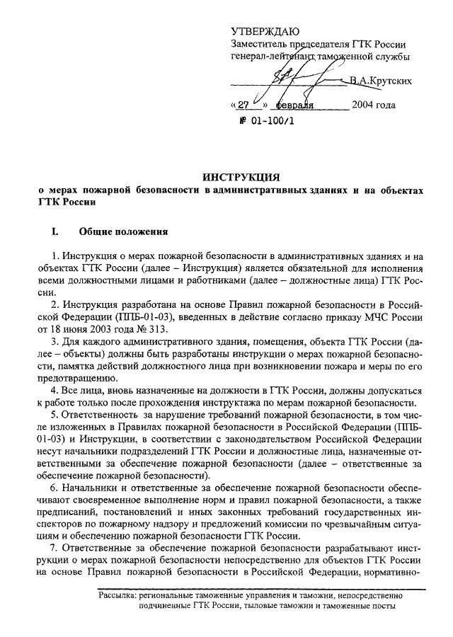 "ИНСТРУКЦИЯ О МЕРАХ ПОЖАРНОЙ БЕЗОПАСНОСТИ В АДМИНИСТРАТИВНЫХ ЗДАНИЯХ И НА ОБЪЕКТАХ ГТК РОССИИ"