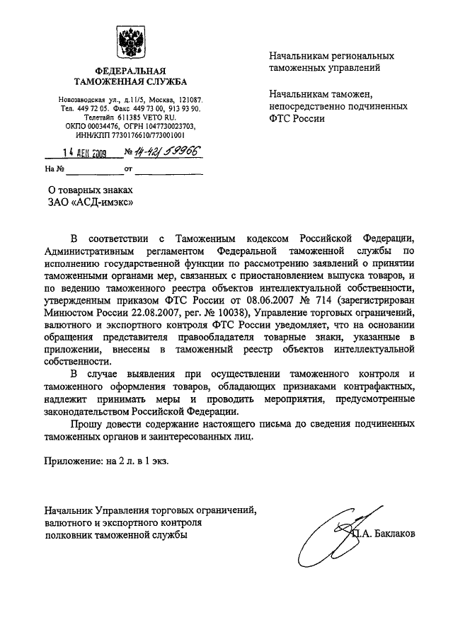 ПИСЬМО ФТС РФ от 14.12.2009 N 14-42/59966