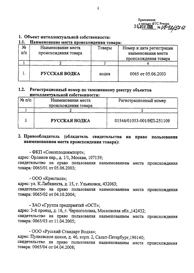 "О НАИМЕНОВАНИИ МЕСТА ПРОИСХОЖДЕНИЯ ТОВАРА "РУССКАЯ ВОДКА"