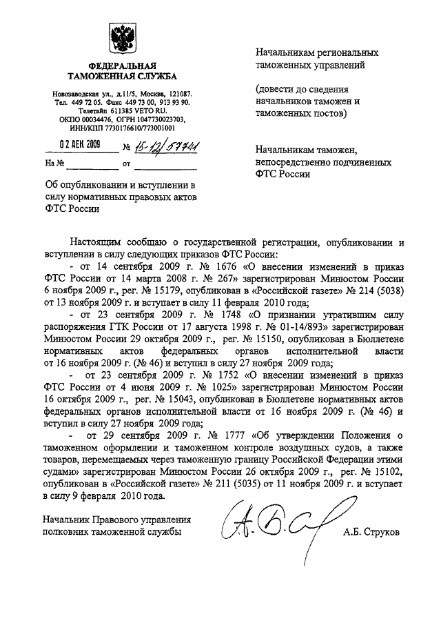 "ОБ ОПУБЛИКОВАНИИ И ВСТУПЛЕНИИ В СИЛУ НОРМАТИВНЫХ ПРАВОВЫХ АКТОВ ФТС РОССИИ"