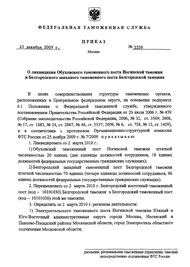 ПРИКАЗ ФТС РФ от 23.12.2009 N 2338