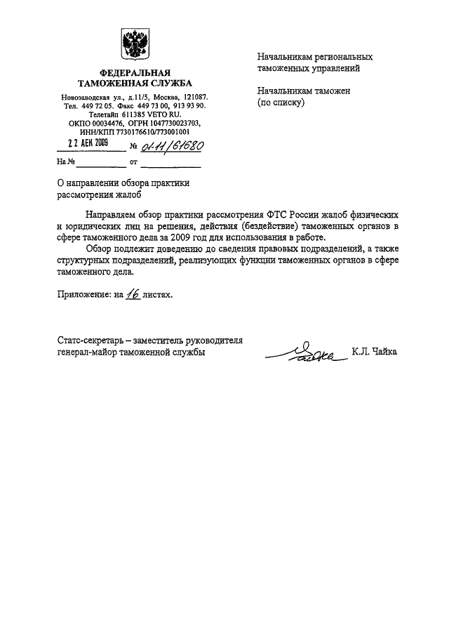 ПИСЬМО ФТС РФ от 22.12.2009 N 01-11/61680 "О НАПРАВЛЕНИИ ОБЗОРА ПРАКТИКИ РАССМОТРЕНИЯ ЖАЛОБ" (вместе с "ОБЗОРОМ ПРАКТИКИ РАССМОТРЕНИЯ ФТС РОССИИ ЖАЛОБ