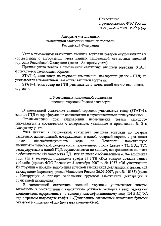 РАСПОРЯЖЕНИЕ ФТС РФ от 29.12.2009 N 241-р