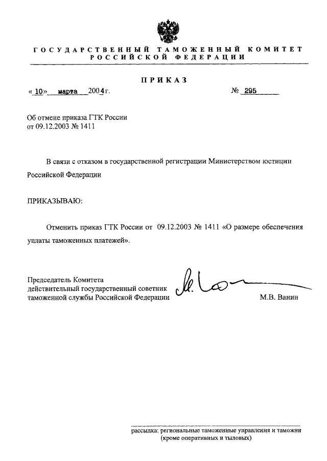 ПРИКАЗ ГТК РФ от 10.03.2004 N 295