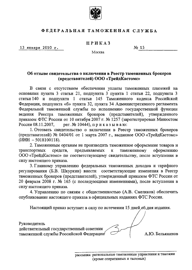 ПРИКАЗ ФТС РФ от 13.01.2010 N 15