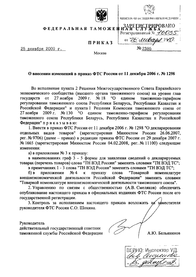 ПРИКАЗ ФТС РФ от 25.12.2009 N 2385