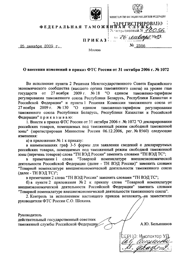 ПРИКАЗ ФТС РФ от 25.12.2009 N 2386
