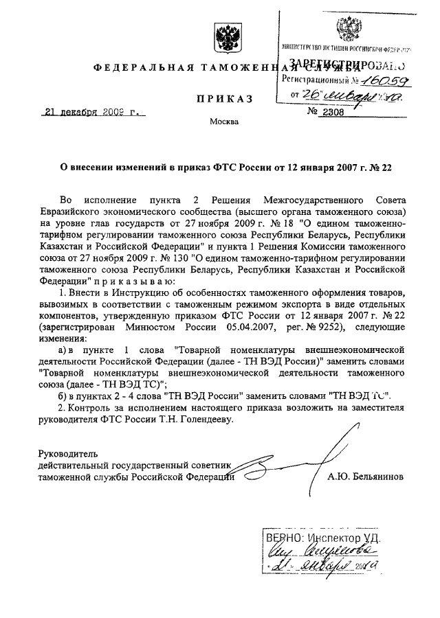 ПРИКАЗ ФТС РФ от 21.12.2009 N 2308