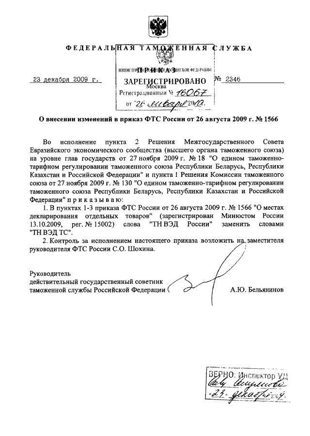 "О ВНЕСЕНИИ ИЗМЕНЕНИЙ В ПРИКАЗ ФТС РОССИИ ОТ 26 АВГУСТА 2009 Г. N 1566"