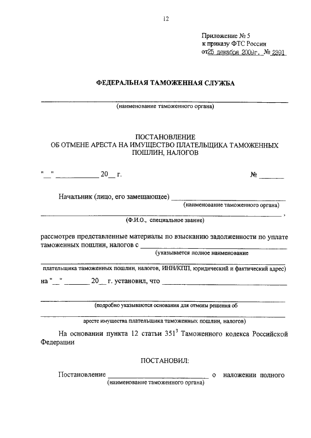 ПРИКАЗ ФТС РФ от 25.12.2009 N 2391